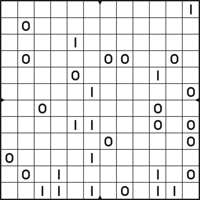 A daily binairo puzzle! Solve each puzzle with only 0's and 1's. Remember: No more than two the same numbers may be placed directly next to or below each other. Every row and every column must contain as many zeroes as ones. The combination of zeroes and ones in every row must be unique, as does the combination in each column.