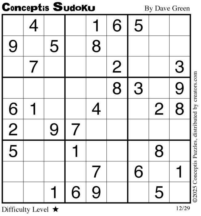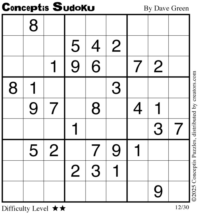 Each puzzle consists of a 9x9 grid containing given clues in various places. The object is to fill all empty squares so that the numbers 1 to 9 appear exactly once in each row, column and 3x3 box.